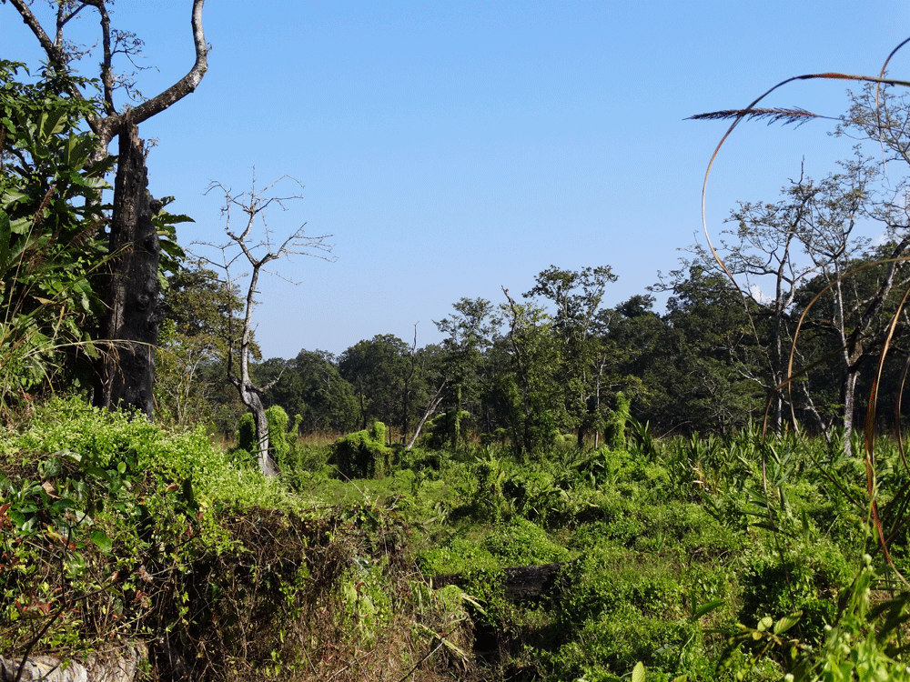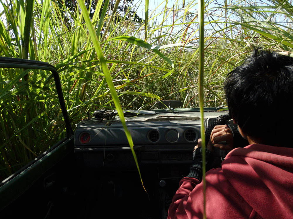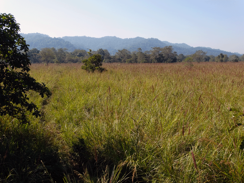 Een van de redenen hiervoor is het metershoge gras wat een groot gedeelte van het park beslaat. De grassoorten en het riet kunnen zomaar twee tot drie meter hoog worden. Voor de tijger een heerlijk gebied om zich doorheen te manoufleren, maar voor ons een ondoordringbare muur om doorheen te kijken.