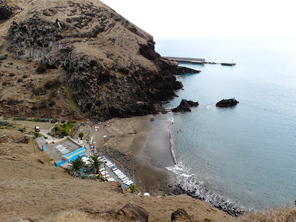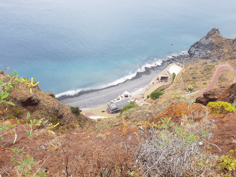 Let goed op, want voor je het weet ben je er voorbij. Het strand is vooral goed te herkennen aan de auto’s die langs de weg geparkeerd zijn. Dit is precies waardoor wij dit strand ontdekten, door gewoon te gaan kijken waarom al die auto’s juist daar geparkeerd stonden. Een fijne verassing na een warme wandeling bij Ponta de Sao Lourenco. Om bij het strand te komen, moet je een stukje afdalen. Neem de trap naar beneden en je komt uit bij een kleine baai met een fijn kiezelstrand.
