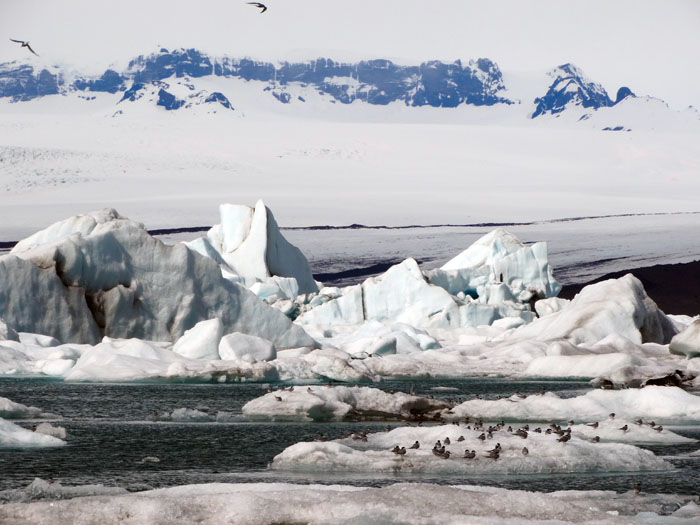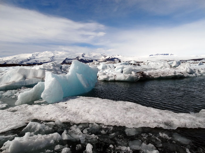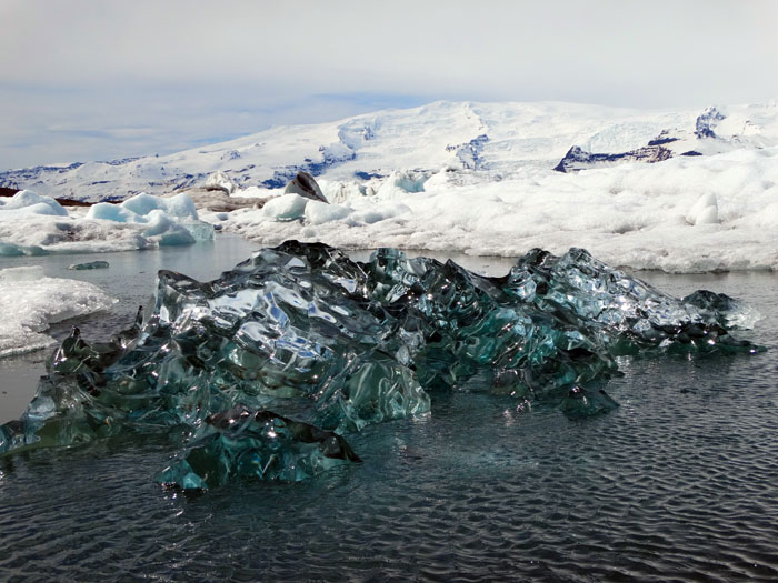 In het gletsjermeer drijven overal ijsschotsen in de meest uitlopende vormen en maten. Sommige ijsschotsen zijn zo groot, dat ze meer lijken op maagdelijk witte ijsbergen. Andere zijn wat bruiner van kleur door vermenging met de aarde. Maar kijk je goed, dat zal je zelfs af en toe een ijsschots spotten, zo helder als een diamant en fonkelend in het licht van de zon. Deze ijsschotsen lijken gemaakt van helder glas, geslepen in allerlei facetten en gevormd door het ijskoude water.