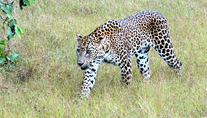 We kwamen aan bij een open vlakte waar al twee lokale jeeps geparkeerd stonden. Ze hadden een schaduw gezien van iets wat misschien wel een luipaard zou kunnen zijn. Meteen ben je alert. De minuten verstreken en we zagen helemaal niets. Toen leek het om ons heen opeens plotseling stiller te worden. Soms heb je van die momenten dat je weet wat er gaat gebeuren. Dat je weet dat wat er gaat volgen heel bijzonder is. En bijzonder was het zeker. Langzaam kwam vanuit een opening tussen de bomen een luipaard aangelopen. De manier waarop een luipaard loopt is ontzagwekkend, atletische en elegant te gelijk. Het maakt indruk. De luipaard liep langzaam het open veld op en nu kon je ook goed zien hoe groot hij was. Het was overduidelijk een mannelijk exemplaar.