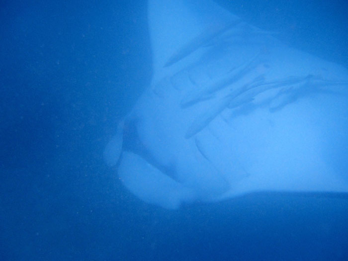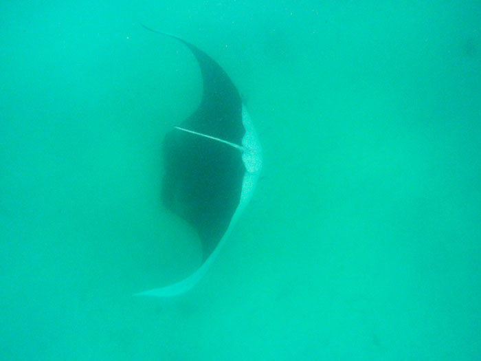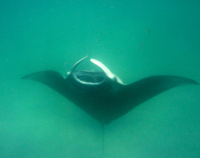 De manta voedt zich met plankton en kleine visjes die uit het water worden gefilterd. Het water komt binnen door de in verhouding brede mond, als in een soort trechter en gaat weer naar buiten via de kieuwen, de plankton en visjes achterlatend, die daarna worden doorgeslikt. Je hoeft dan ook tijdens het snorkelen niet bang te zijn voor ze, ze zullen je absoluut niets doen.